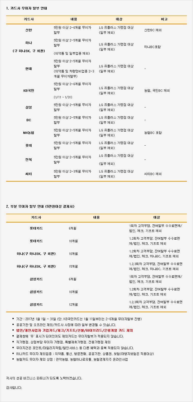 2017년 1월 신용카드 무이자 할부 행사 안내